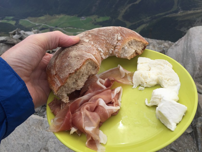 Når lunchen består av lokalprodusert spekeskinke, mozzarella og grovbrød, og utsikten dekkes 360 grader av Dolomittene, da blir det ikke bedre.