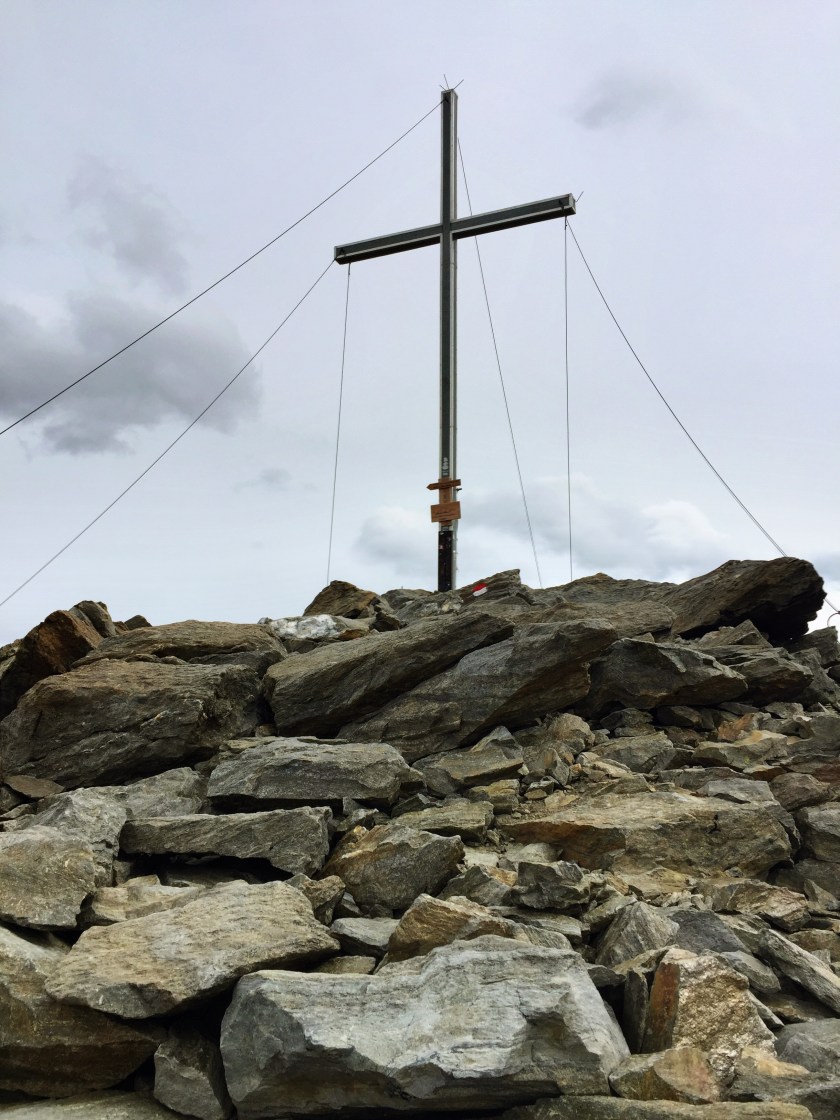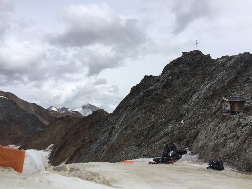 Siden vi var på en 8-timers topptur i går, jukset vi litt og tok kabelbanen opp i dag. Bak huset skimtes korset på Grawandspitze.