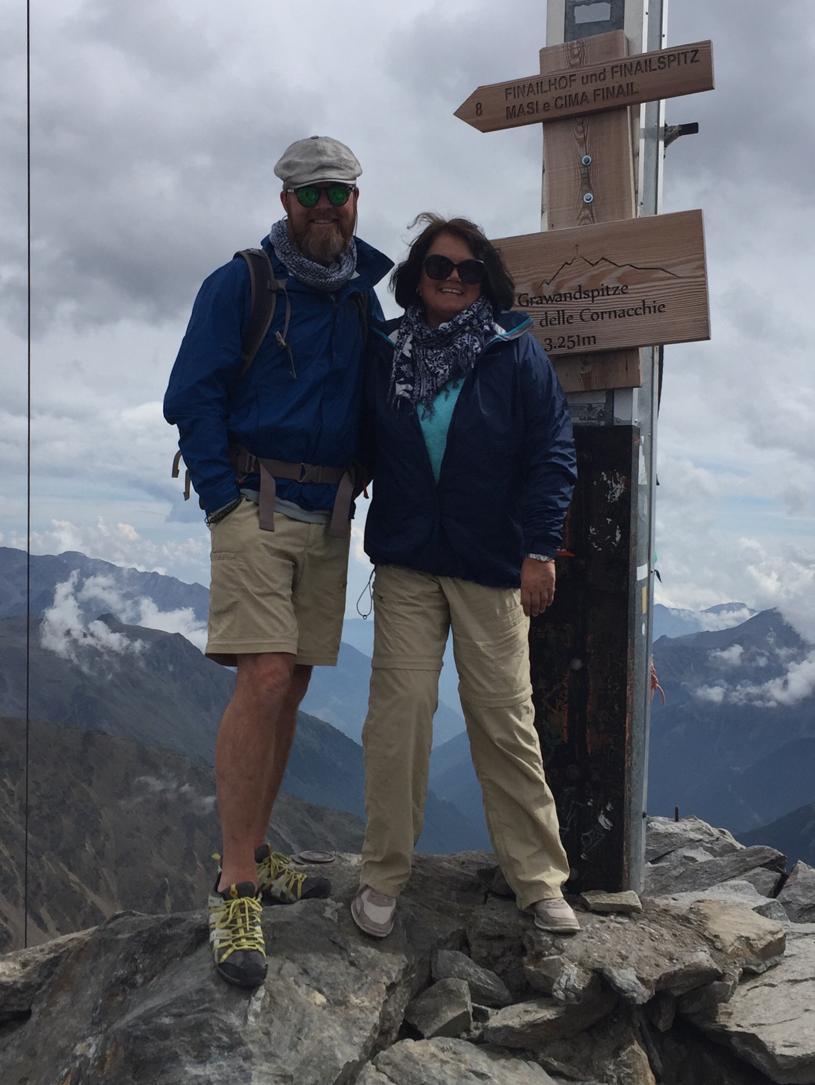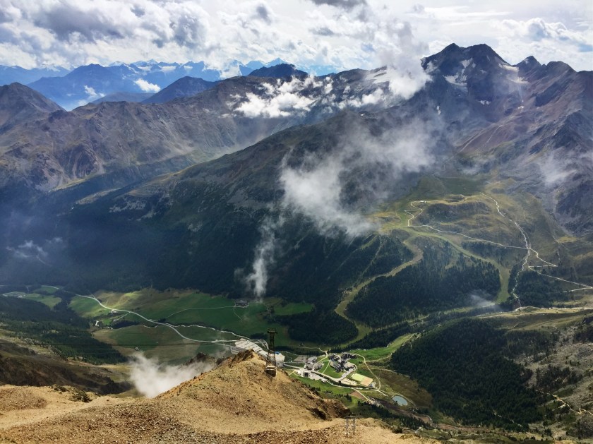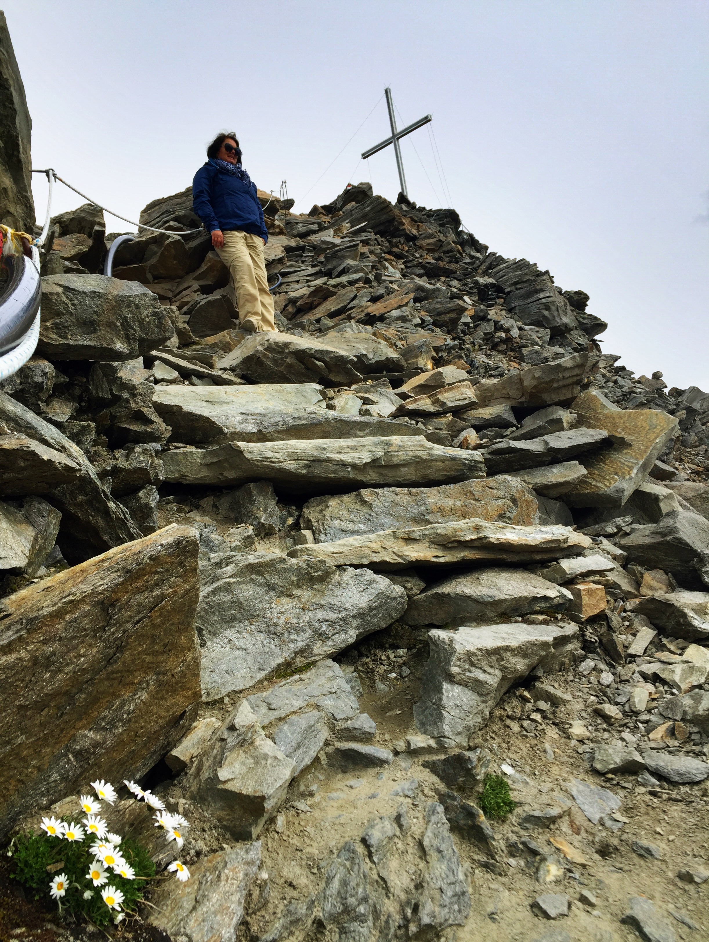 Siden vi var på en 8-timers topptur i går, jukset vi litt og tok kabelbanen opp i dag. Bak huset skimtes korset på Grawandspitze.