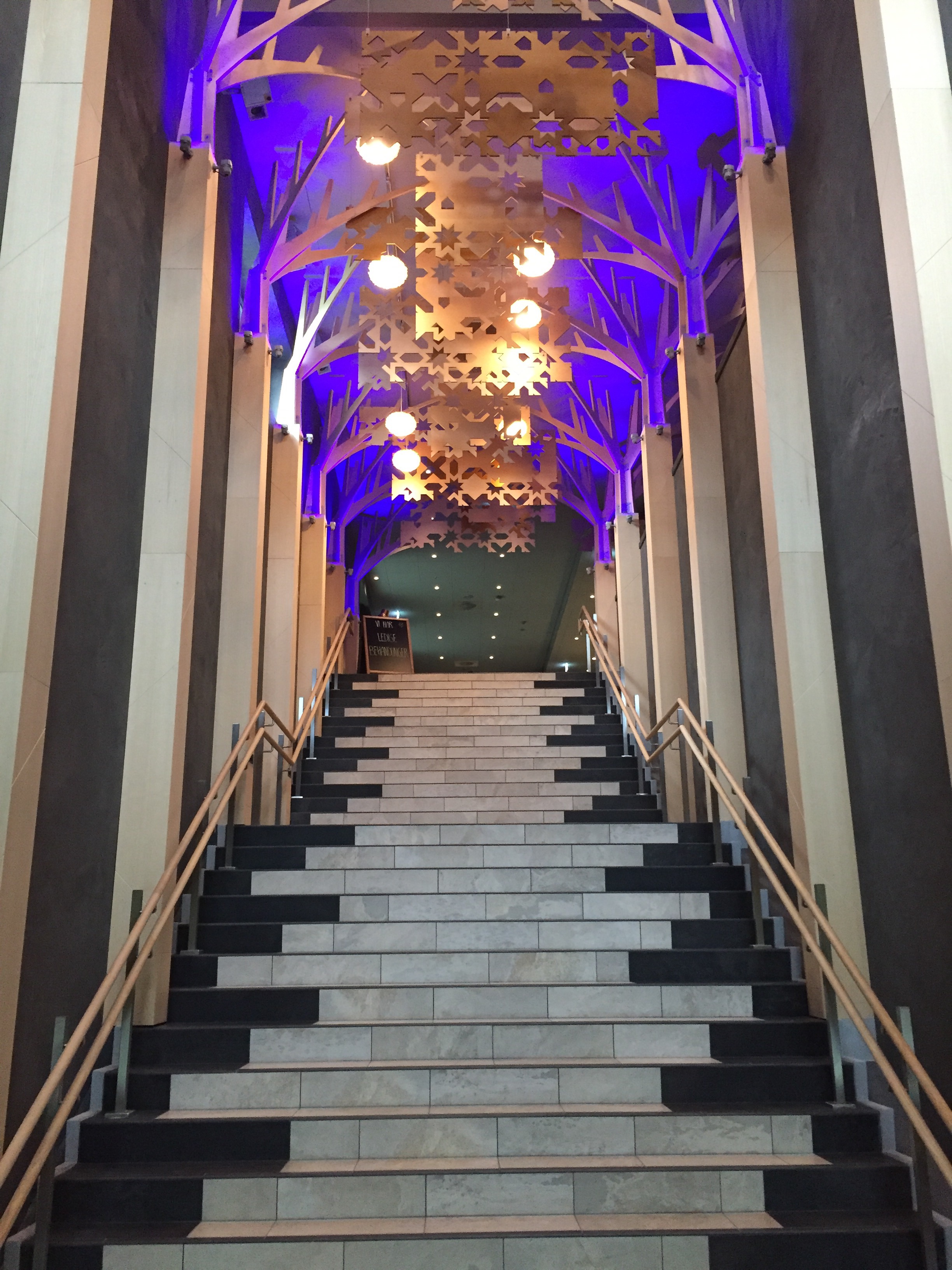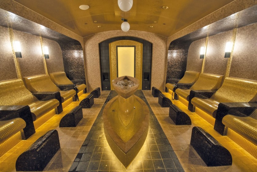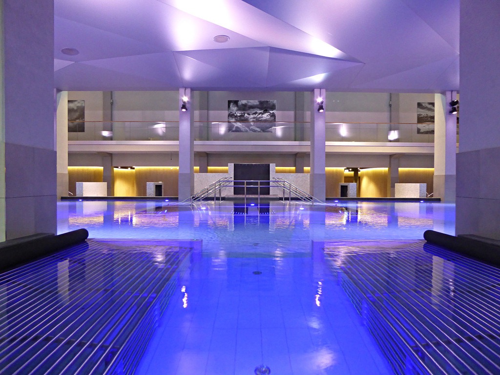 Inne i anlegget er det en dempet, avslappet og svært behagelig atmosfære. Man rusler rundt og velger fritt den type basseng, sauna eller behandling en måtte ønske i de tre etasjene. I toppetasjen er det også en flott restaurant. Det er også boblebad og basseng ute i toppetasjen.