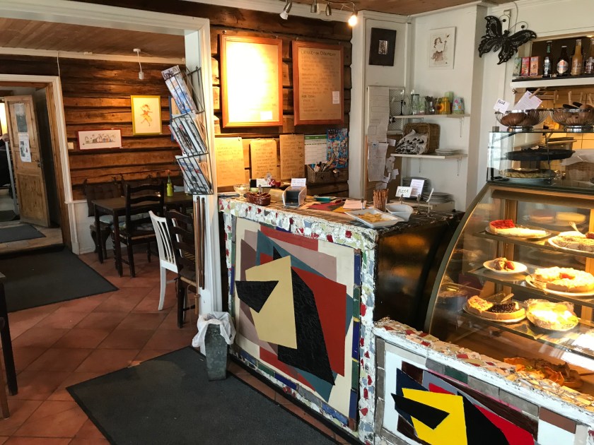 Innvendig er Teskjea et herlig lappverk av stoler og bord i en rekke varianter. Det er kriker og kroker alle steder, og kunst på alle vegger – og vel så det.