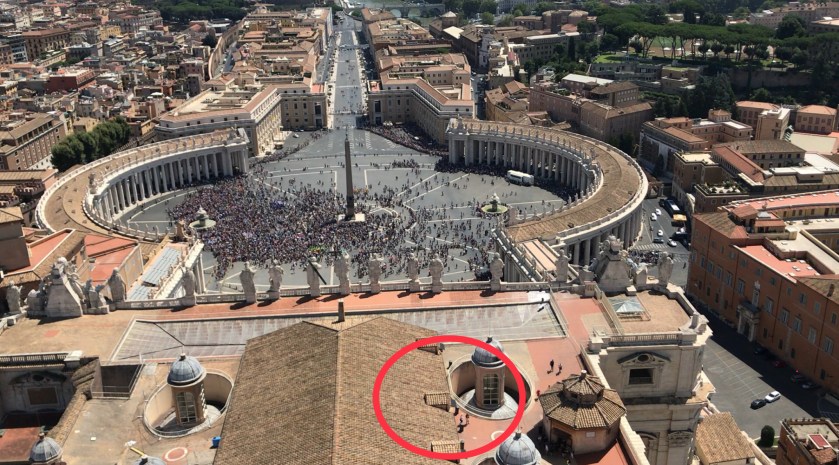 Taket over Peterskirken er et flott sted å ta en pause på veg ned fra kuppelen. Her er det også gratis friskt og kaldt drikkevann fra en veggfontene.