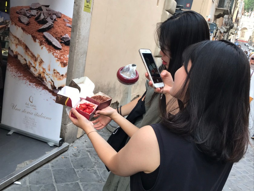 I løpet av de minuttene vi stod utenfor Pompi, ble det tatt et usannsynlig stort antall bilder til ymse sosiale medier. Gråskjeggbloggern var den udiskutabelt eldste, og følte seg nesten som en rosablogger, blant et par titalls ungjenter.