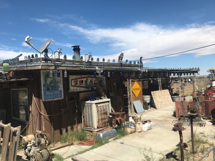 «179 km nord-øst for Santa Monica Pier i LA og endepunktet for Route 66, ligger Elmer’s Bottle Tree Ranch – på folkemunne bare Elmer`s Place. En merksnodig blanding av flaskeutstilling og …gudene vet hva, midt i ørkenen mellom Victorville og Barstow.»