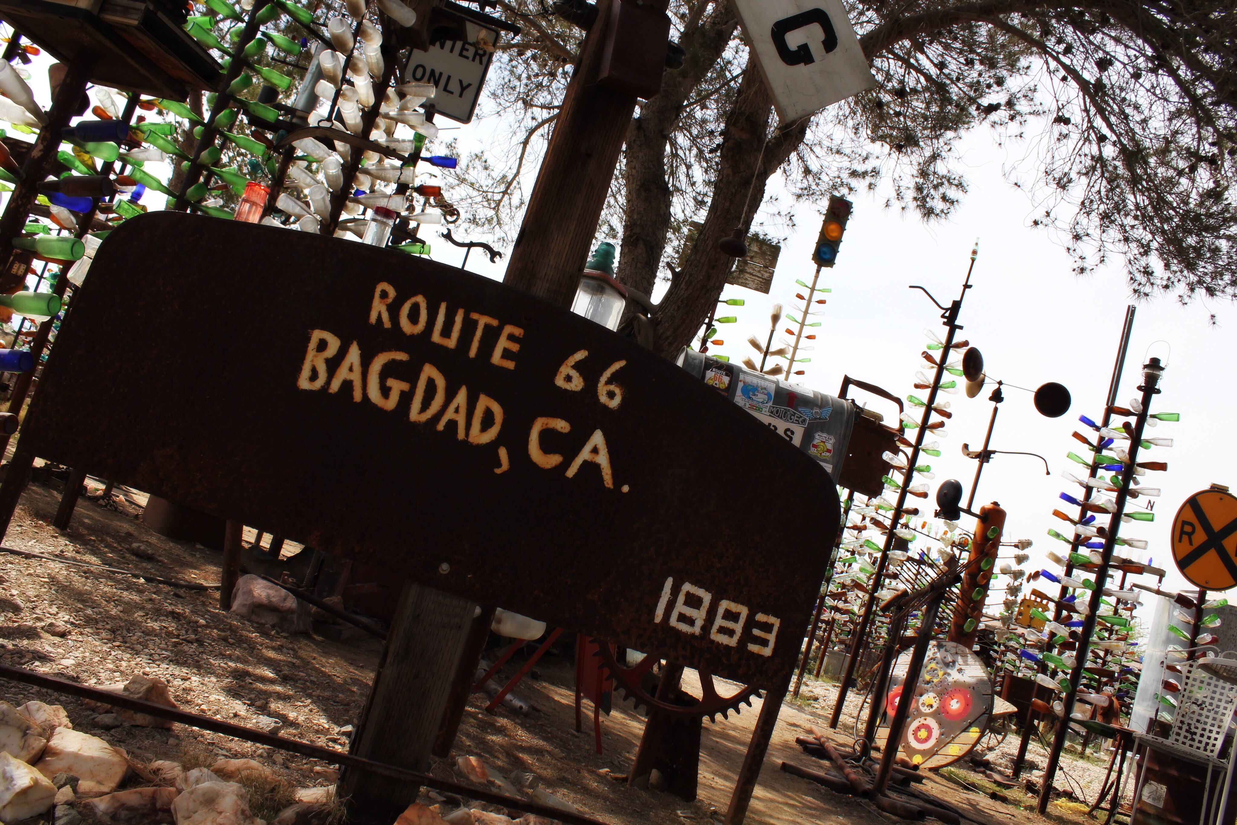 «179 km nord-øst for Santa Monica Pier i LA og endepunktet for Route 66, ligger Elmer’s Bottle Tree Ranch – på folkemunne bare Elmer`s Place. En merksnodig blanding av flaskeutstilling og …gudene vet hva, midt i ørkenen mellom Victorville og Barstow.»