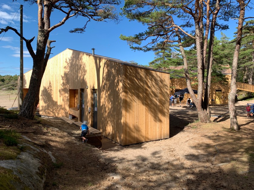 De nye byggene har en overraskende moderne utforming og design. Her er det også lademuligheter for mobiltelefoner. Selv om vi liker å bo på en 60-talls teltplass, trenger vi strøm til mobilen, må vite.