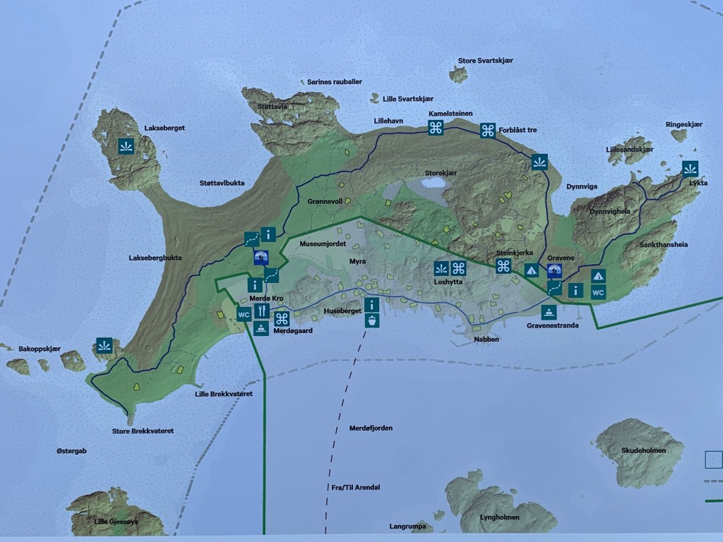 Merdø en flott øy å gå på tur på. Det er lager egne merkede kyststier. Husk bare å ha med joggesko til disse turene, da de ikke er egnet for badesko eller slipperser – selv om vi så noen som forsøkte, med varierende grad av hell.