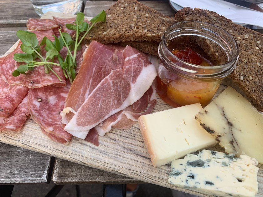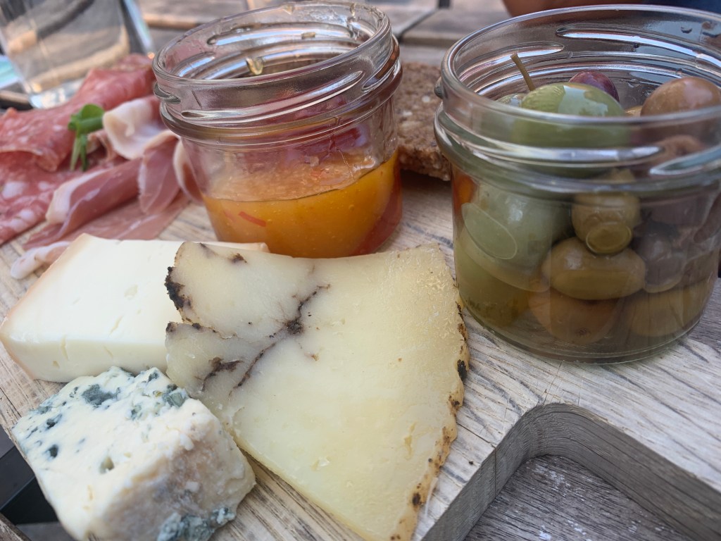 Hyggefjøla består av Trøffel pecorio, L’Etivaz Fromage, Brillat savarin, Parmaskinke, tomatmarmelade, trøffelsalami og surdeigsbrød.
