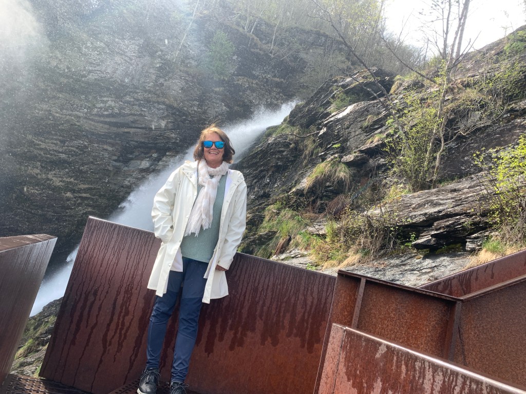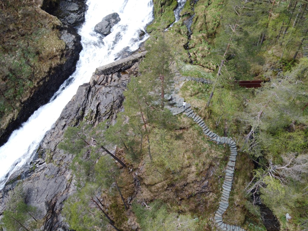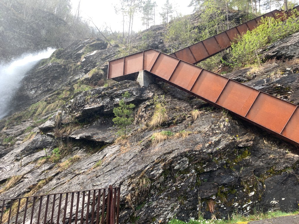 Jeg anbefaler på det sterkeste ha med seg en regnjakke på fotturen oppover juvet. Stiene og trappene gir tilgang til nærkontakt med fossen på en svært trygg, men tidvis våt måte.
