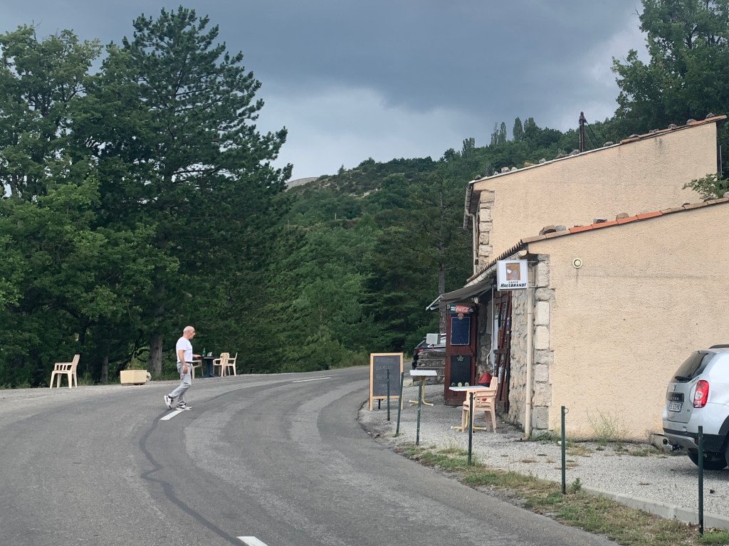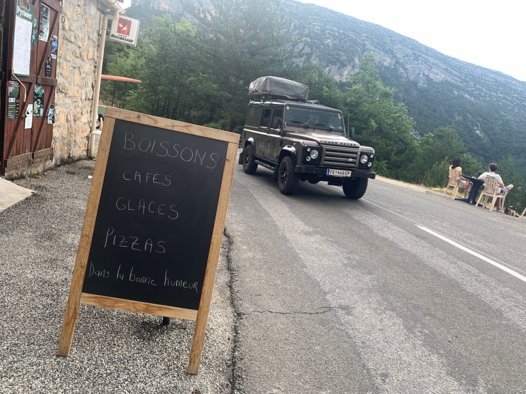 «Du sitter på en billig plaststol med tærne på kanten av en stupbratt skråning, med en fantastisk utsikt over Grand Canyon Verdon. Ca. 1,5 meter bak ryggen din suser bilene forbi på den trafikerte turistvegen Route Departementale 952 i hjertet av Provence. Samtidig småløper Jean Louis frem og tilbake over vegen med pizza og rosévin. Dette er lokalt næringsliv og trafikksikkerhet på fransk!»