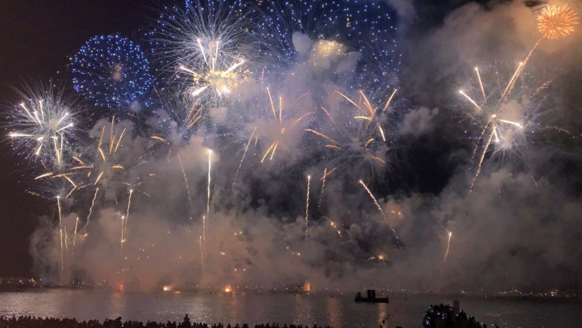 Høytalerne på lekterne er så store og kraftige at musikken fyller hele bukta og havna, og gir fyrverkeriet en ekstra dimensjon.