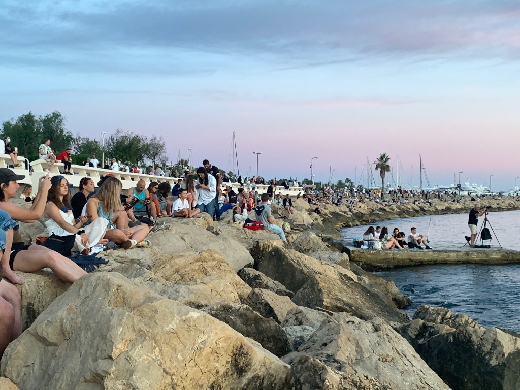 I timene før forestillingen starter, er det et yrende liv på stranda og langs promenaden. folk har med seg mat og drikke og koser seg i påvente av «festen».