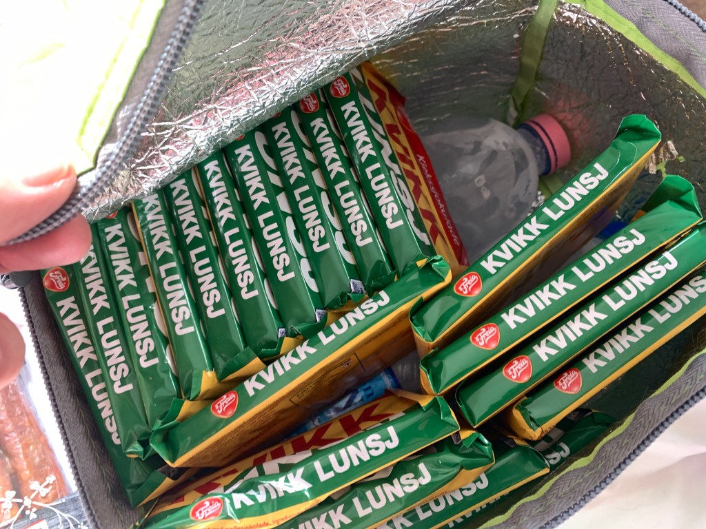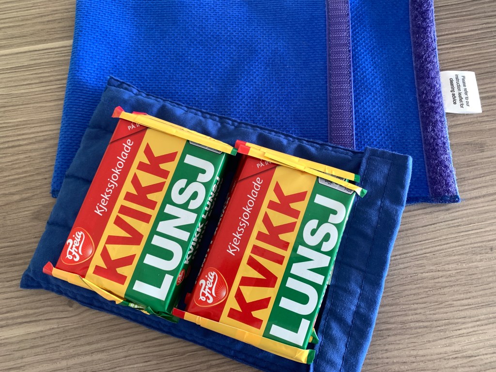 Det innebærer en egen medisinsk minikjølebag i passende størrelse til hele sjokoladelageret. Her benytter vi en dypfrossen vannflaske som kjøleelement, i stedet for et ordinært element. Da har vi også kaldt drikke ved behov under veis.