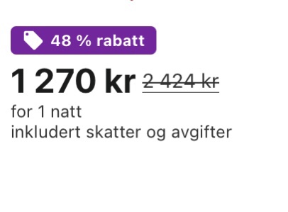 «På Booking stod romprisen oppgitt til NOK 1 264 (med fet skrift). Totalprisen var imidlertid NOK 4 015. De hadde ikke tatt med hotellavgift, reisemålsavgift, skatt, turistavgift, serviceavgift og rengjøringsgebyr! På Hotels er alltid alt inkludert.»
