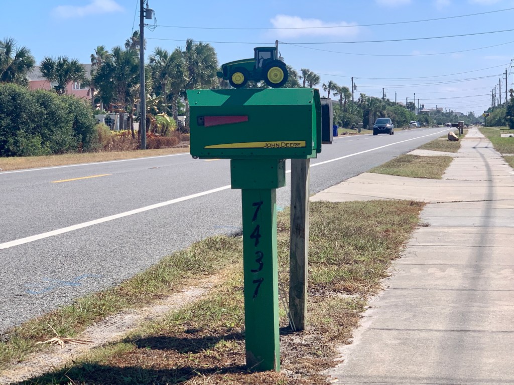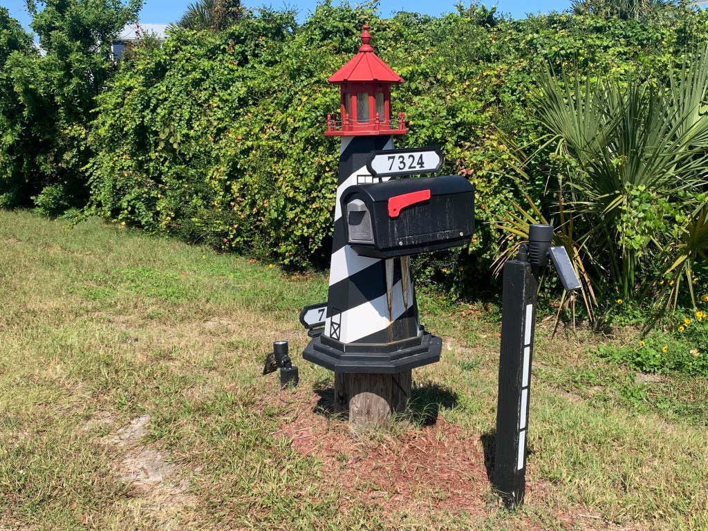 Det er åpenbart en ganske vanlig «greie» å ha særegne og kunstneriske postkasser langs denne kjente og historiske vegen. Les gjerne de andre bloggene mine om samme fenomen: Postkassene langs Florida Keys, Floridas morsomste jobb? og Postkassene langs A1A