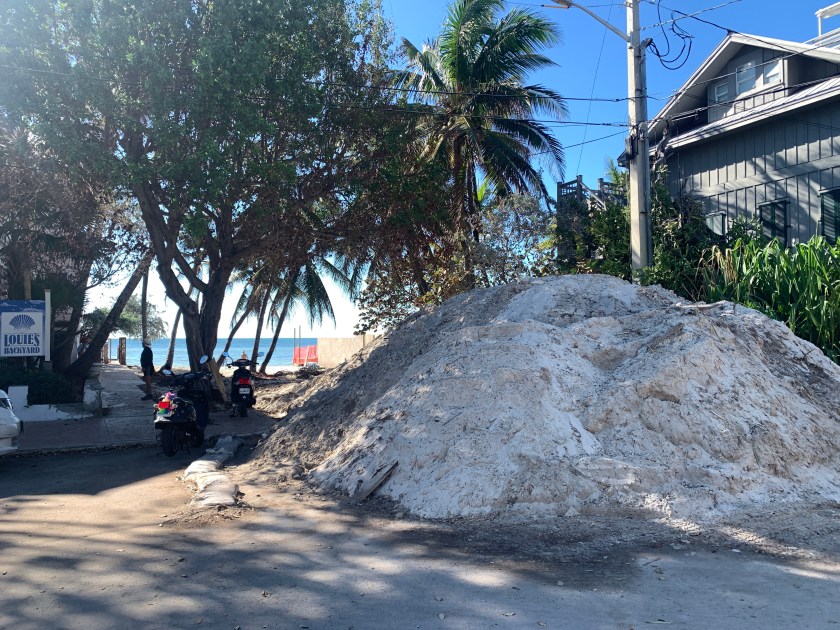 Atlantic Blvd. går parallelt med Atlanterhavet langs den sørlige stranda og kysten på Key West. Som det skimtes midt på bildet, har man laget enorme sandmoloer langs det meste av stranda. Tusenvis av tonn med sand ble tømt langs og på stranda, for å forsøke å hindre de enorme bølgene som kom inn fra sør.