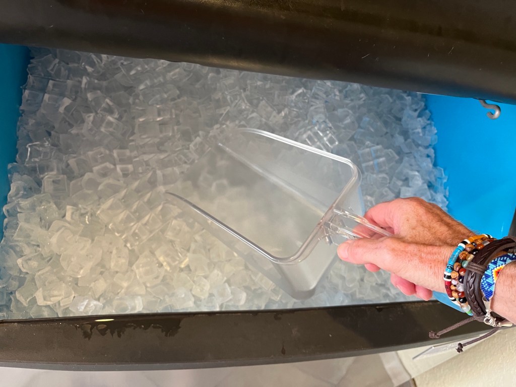 Det blå kjølebagen er stappfull med flere liter iskaldt drikke.
