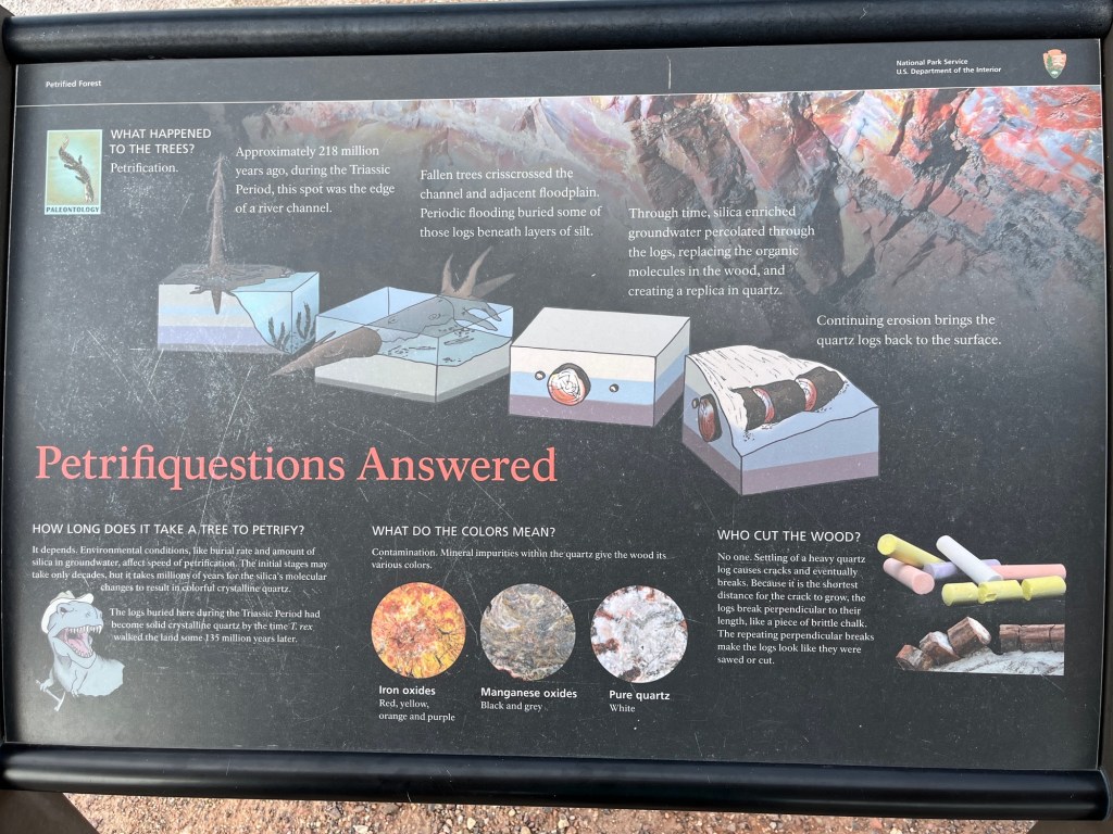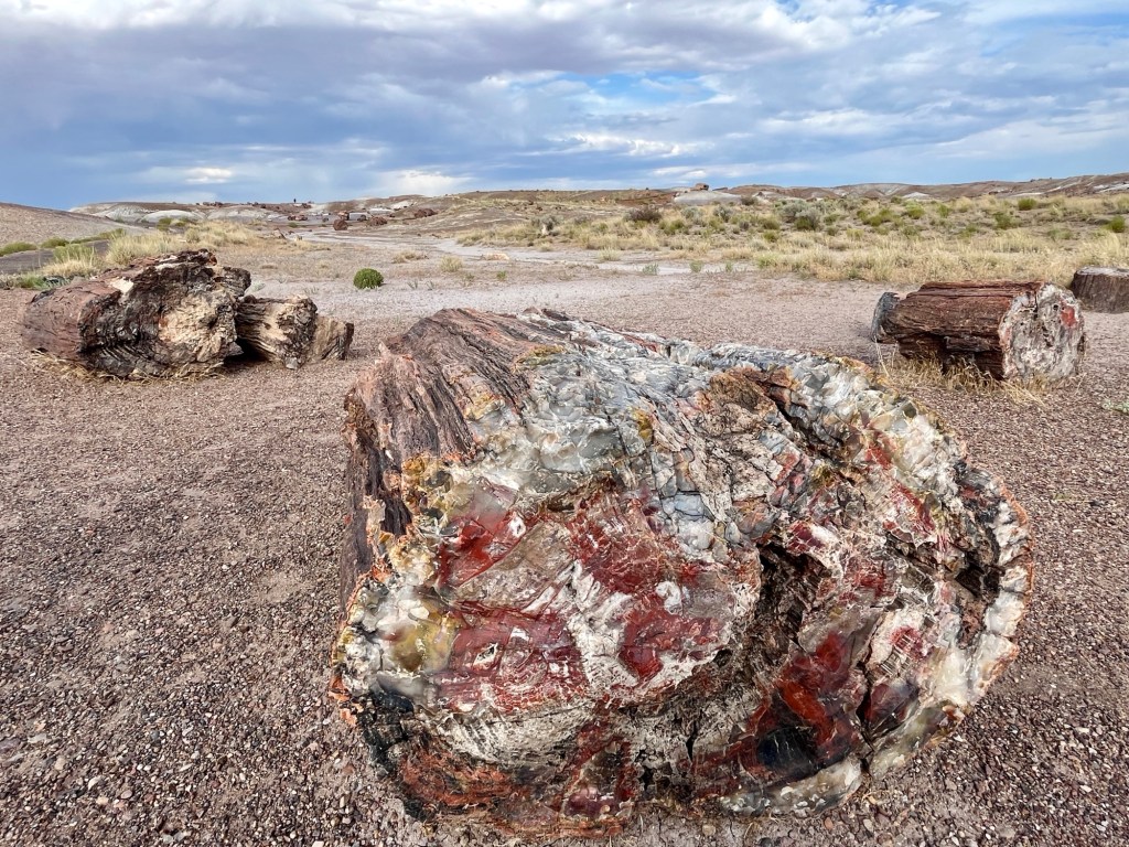 Trærne, hovedsakelig av arten Araucarioxylon arizonicum, ligger nå spredt over landskapet og ser ut som om de er kuttet med en sag, på grunn av kvartsens sprø natur som får dem til å bryte rent når de utsettes for stress.