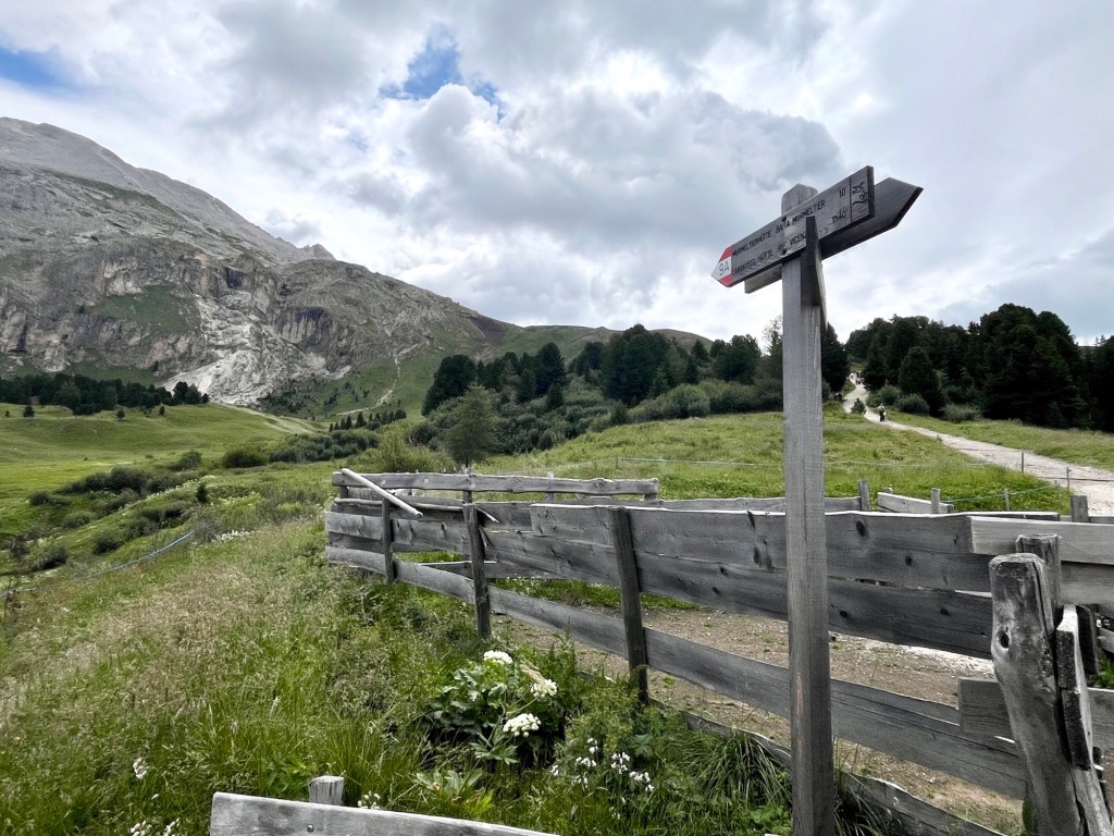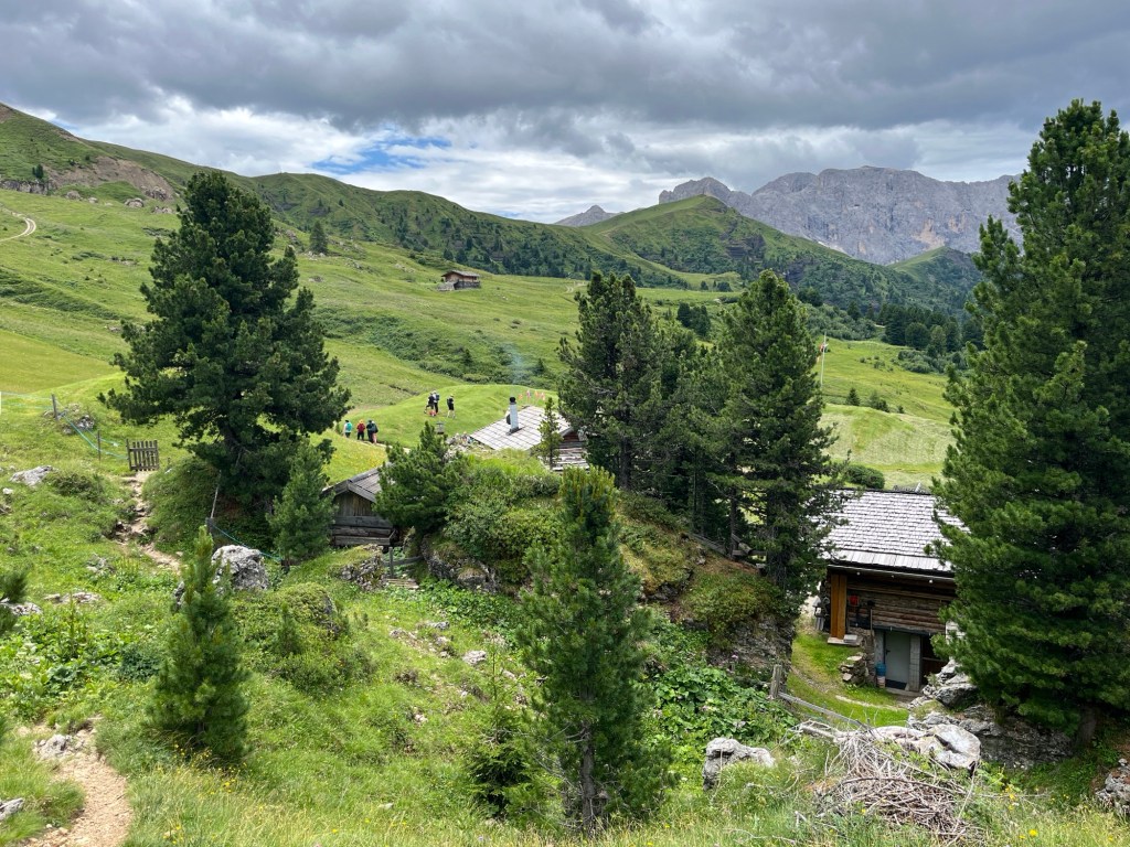 Utsikten gjør det lett å glemme tiden – med Langkofel og Plattkofel som bakteppe, og åpne, grønne enger foran deg. Dette er klassisk Seiser Alm-terreng: vennlig, vakkert og akkurat passe dramatisk.