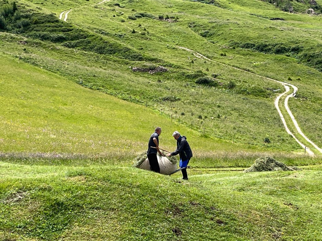 Murmeltierhütte ligger lunt til i en liten gressbakke, med benker både ute og inne. Eieren er i ferd med å slå gresset. Innsamling av høyet skjer på gamlemåten – med rive og trillebår.