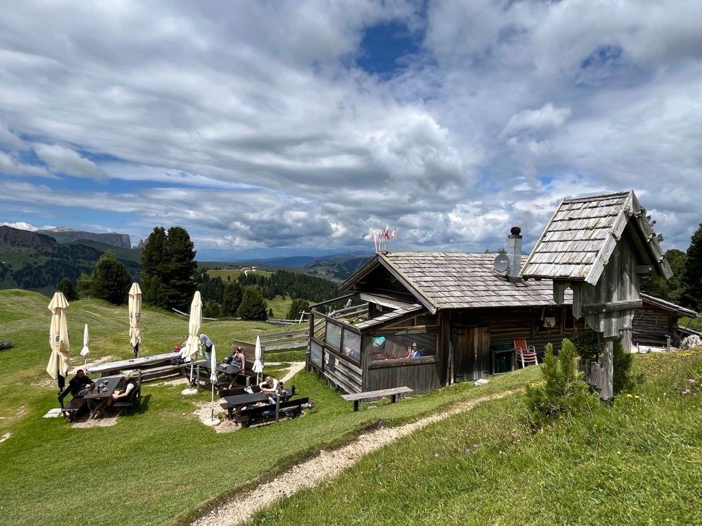 Turen starter altså i Saltria, en rolig liten fjellgrend i Seiser Alm-området. Herfra går Florian-kabelbanen rett opp til Williamshütte – en kjapp tur på noen få minutter. Når du stiger av på toppen, er du allerede på 2100 meter, og Dolomittene åpner seg i all sin prakt.