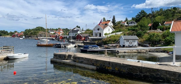 «Etter en halvtimes tur gjennom skjærgården utenfor Arendal med «MF Merdø», gikk vi i land på denne idyllen av en bilfri øy. Hvitmalte, værbitte, gamle