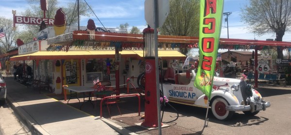 «Legendariske Delgadillo’s Snow Cap Diner i Seligman Arizona, ble hovedsakelig bygget av skraptømmer fra Santa Fe Railway. Eier og humorist Juan Delgadillo brukte humor, tull