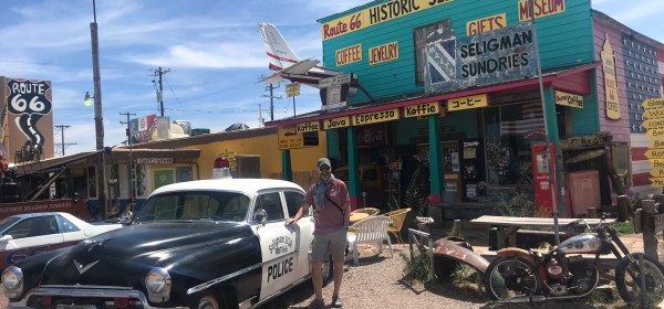 «200 meter vest for legendariske Angel Delgadillo’s Barber i Seligman – langs Historic Route 66, ligger Historic Seligman Sundries. Her finner du Arizonas beste espressokaffe.