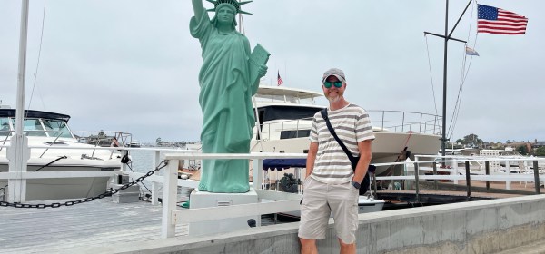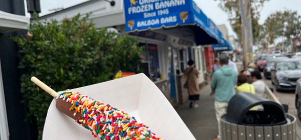 «Balboa Island er en liten øy innenfor Balboa Peninsula i Newport Beach, ca 70 km sør for Los Angeles. Den kjente øya omkranses av en
